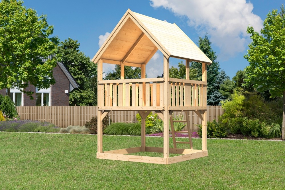 - Integrierter Sandkasten — Großer Spielbereich unter dem Turm direkt inklusive