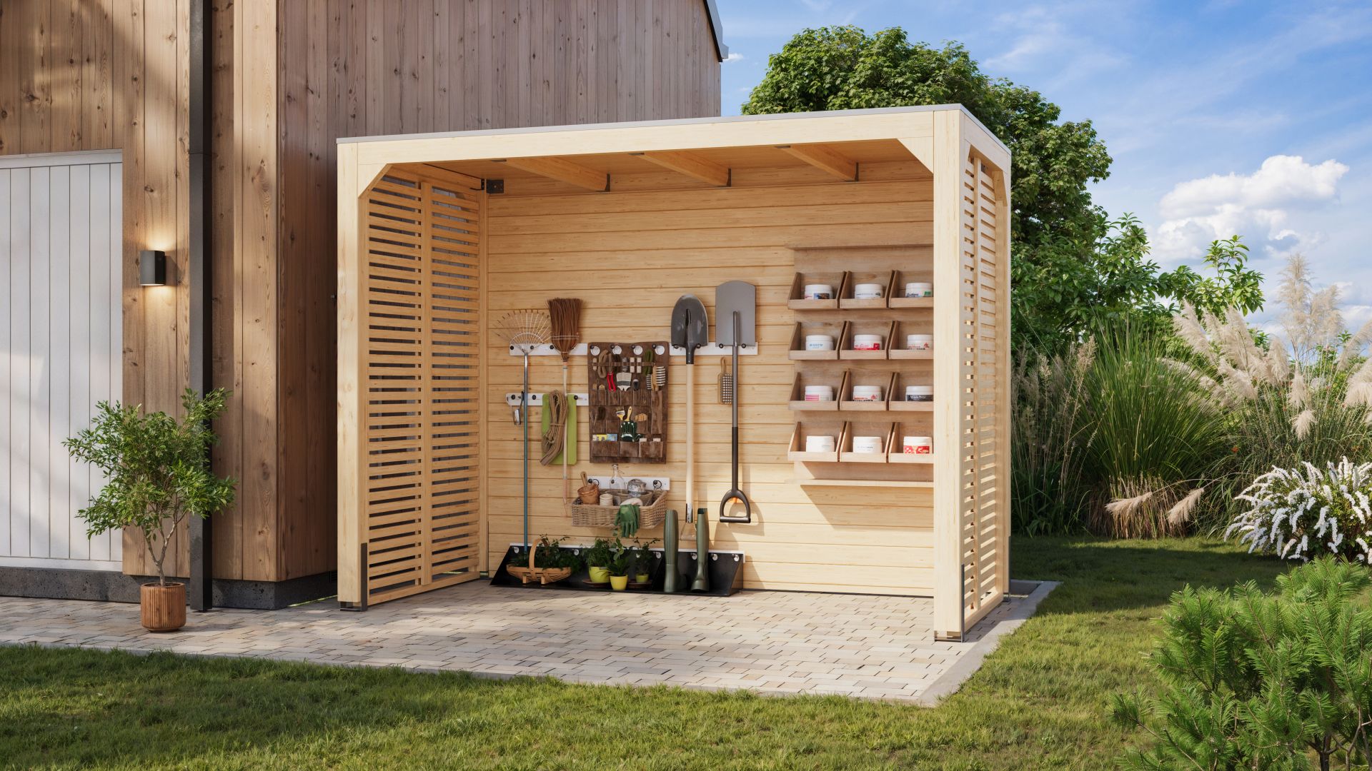 | Contenu de la livraison | Pavillon, paroi de fond, 2x parois à lamelles, 4x ancrages en H, membrane de toit |