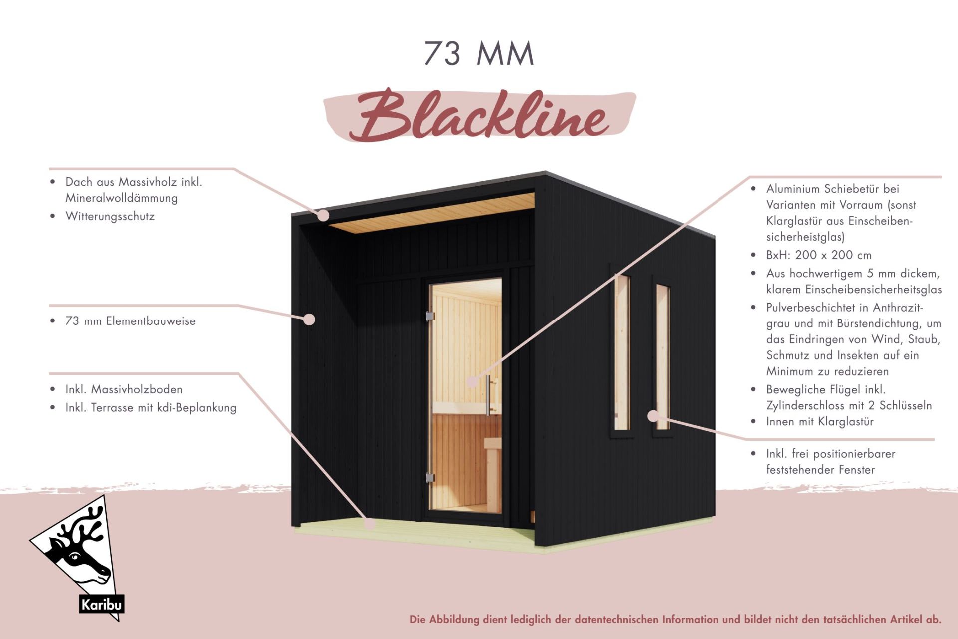 L'élément exceptionnel est l'épaisseur de paroi de 73 mm. Les éléments muraux pré-assemblés sont isolés en usine avec de la laine minérale. Cette isolation thermique performante assure une montée en température rapide et maintient la chaleur stable à l'intérieur, même par grand froid hivernal – ce qui permet d'économiser de l'énergie et de réduire les coûts d'utilisation. La finition extérieure noire moderne confère au bâtiment un aspect noble, parfaitement adapté aux architectures de jardin contemporaines.