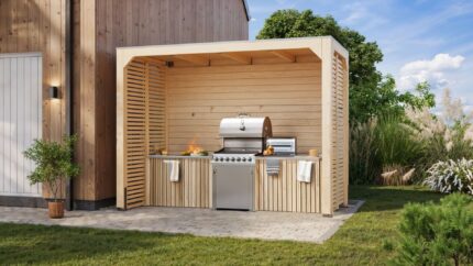 Ästhetik trifft Funktionalität: Die natürliche Maserung des Massivholzes verleiht der Seitenwand eine zeitlose Eleganz, die sich harmonisch in jede Gartenlandschaft einfügt. Ob als Windfang an stürmischen Tagen oder als blickdichter Abschluss zur Nachbargrenze – diese Wand schafft ein gemütliches Ambiente für gesellige Abende oder ruhige Lesestunden.