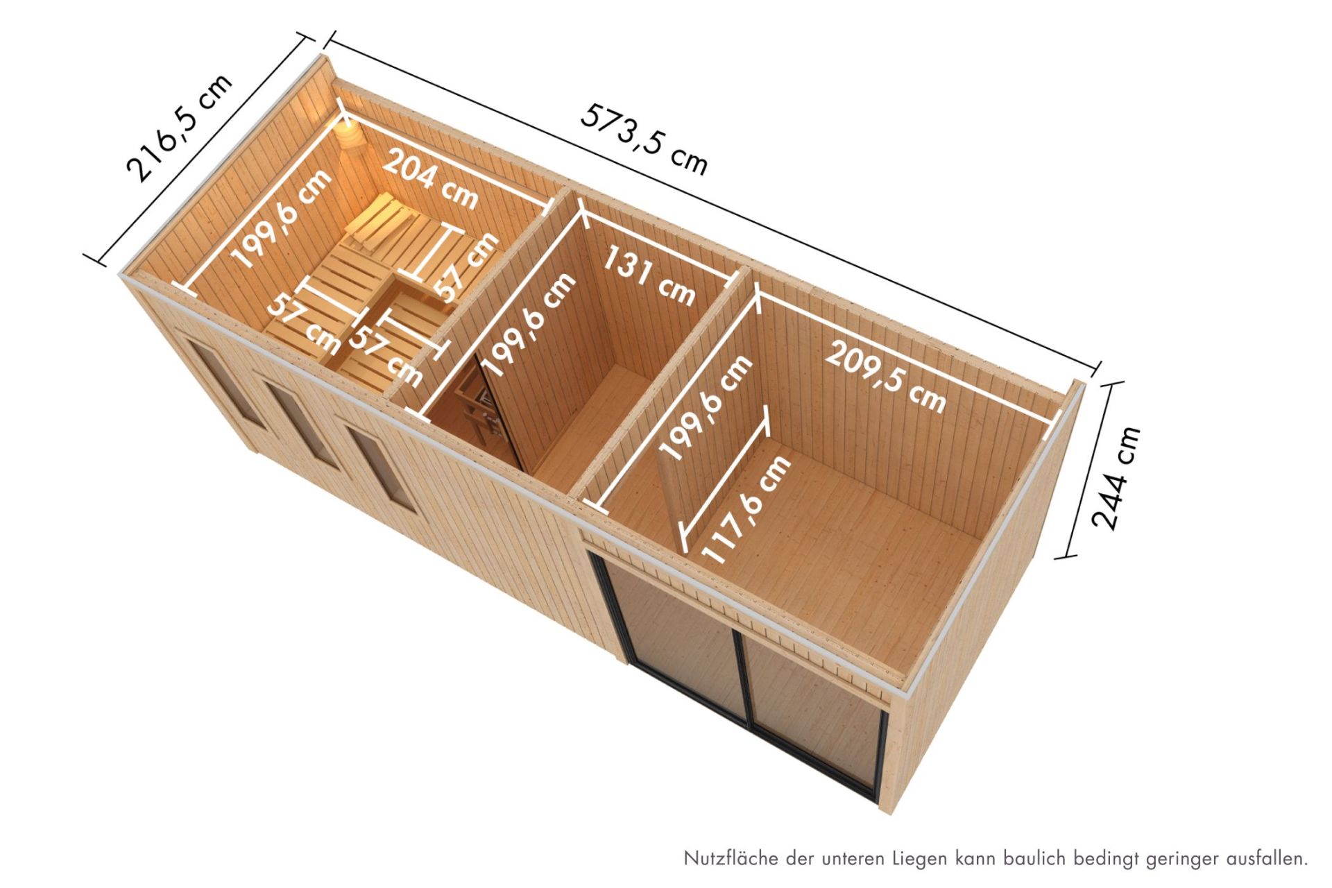 L'espace séparé est idéalement conçu pour l'installation d'une cabine de douche. Cela vous permet de vous rafraîchir immédiatement après votre séance de sauna sans avoir à quitter le bâtiment. Alternativement, vous pouvez y installer un WC ou utiliser l'espace pour dissimuler la technique du sauna.