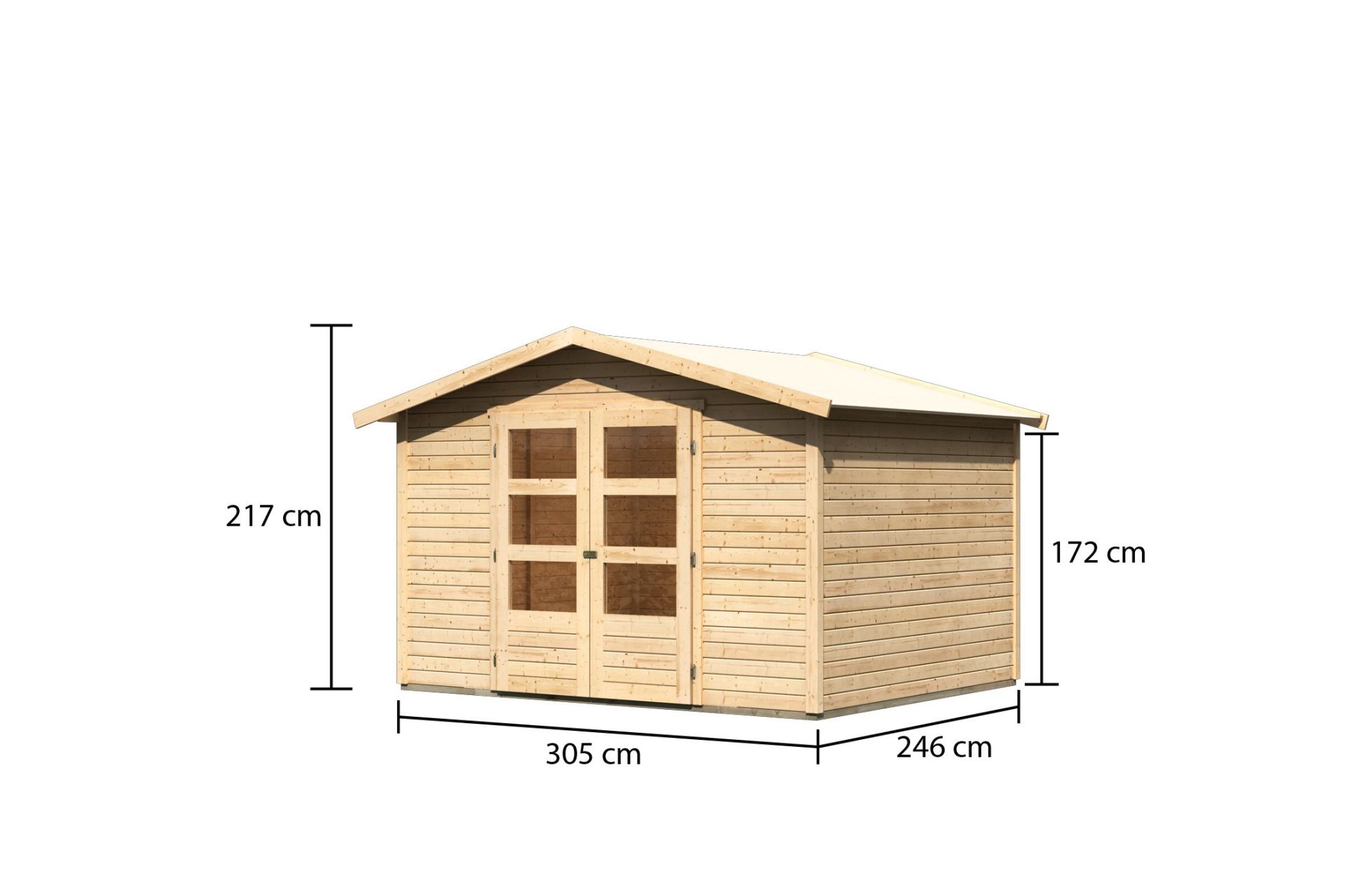 Das Satteldachhaus „Amberg 5″ (305 × 246 cm) bietet mit über 7 m² Grundfläche
