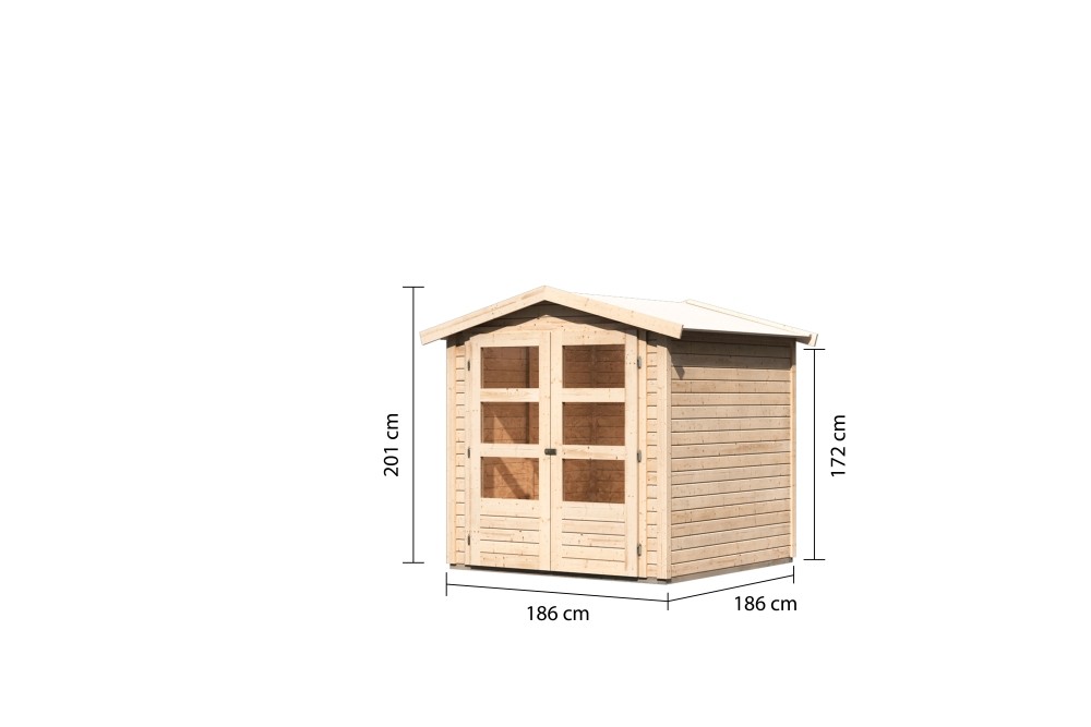 Das Satteldachhaus „Amberg 2″ (186 × 186 cm) ist die ideale Lösung für kleinere Gärten,
