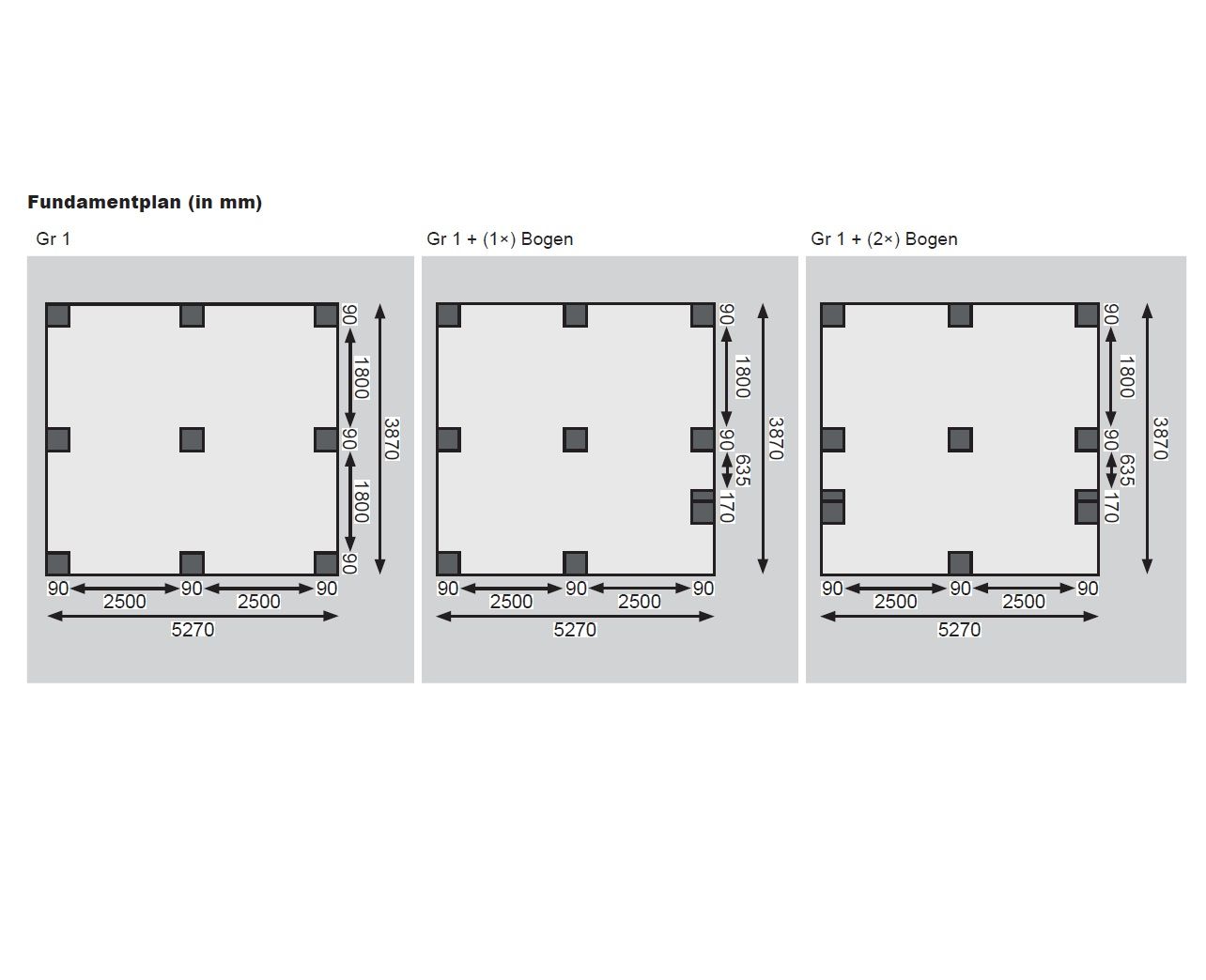 Ein absolut waagerechter Untergrund ist zwingend erforderlich. Wir empfehlen die Errichtung von neun Punktfundamenten (ca. 40x40x80 cm) mit einbetonierten H-Ankern. Dies schützt die Pfosten vor Bodenfeuchtigkeit und sorgt für die notwendige Standfestigkeit bei Sturm.