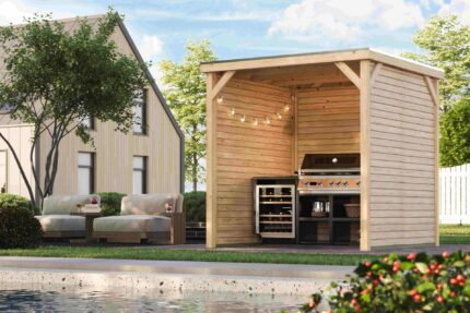 Das Flachdach ist aus massivem Echtholz gefertigt und wird durch eine elegante Aluminium-Abschlussleiste abgerundet, die dem Pavillon eine wertige, architektonische Note verleiht. Ein besonderer Vorteil des Cubeco-Systems ist die Modularität: Erweitern Sie den Pavillon ganz nach Bedarf mit verschiedenen Wandelementen, um Sichtschutz zu schaffen oder eine gemütliche Eck-Lounge zu kreieren.