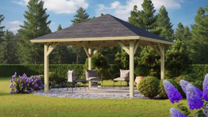 Die Basis für dieses langlebige Gartenbauwerk bilden die 9 x 9 cm starken Duo-Leimholzpfosten. Diese sorgen nicht nur für eine hohe statische Belastbarkeit, sondern minimieren durch ihre spezielle Verleimung auch die natürliche Rissbildung des Holzes. Mit einer Firsthöhe von 243 cm entsteht ein luftiges Raumgefühl, das zum Verweilen einlädt – ob bei einer lebhaften Gartenfeier oder als ruhiger Rückzugsort für Ihre persönliche Auszeit.