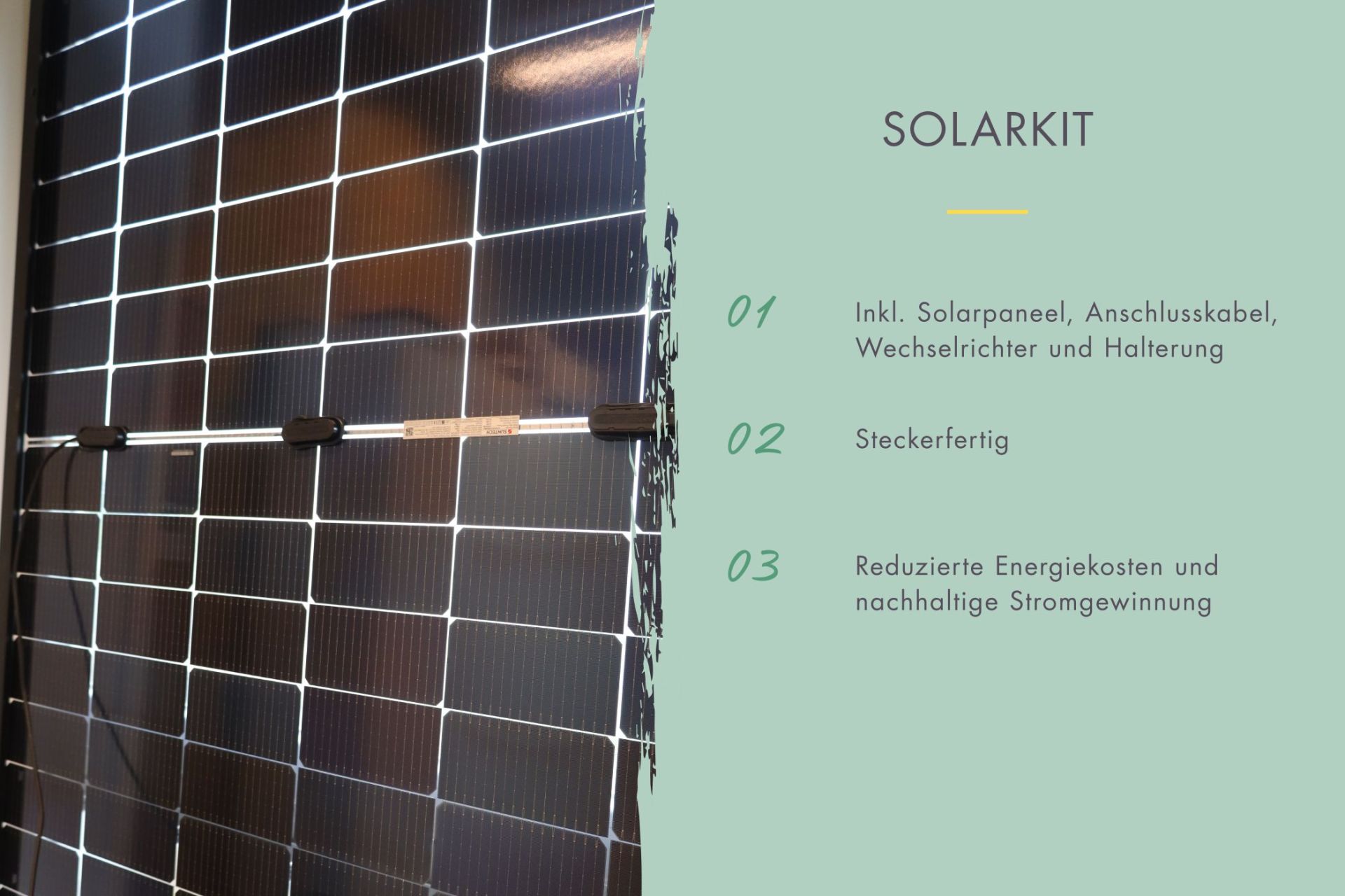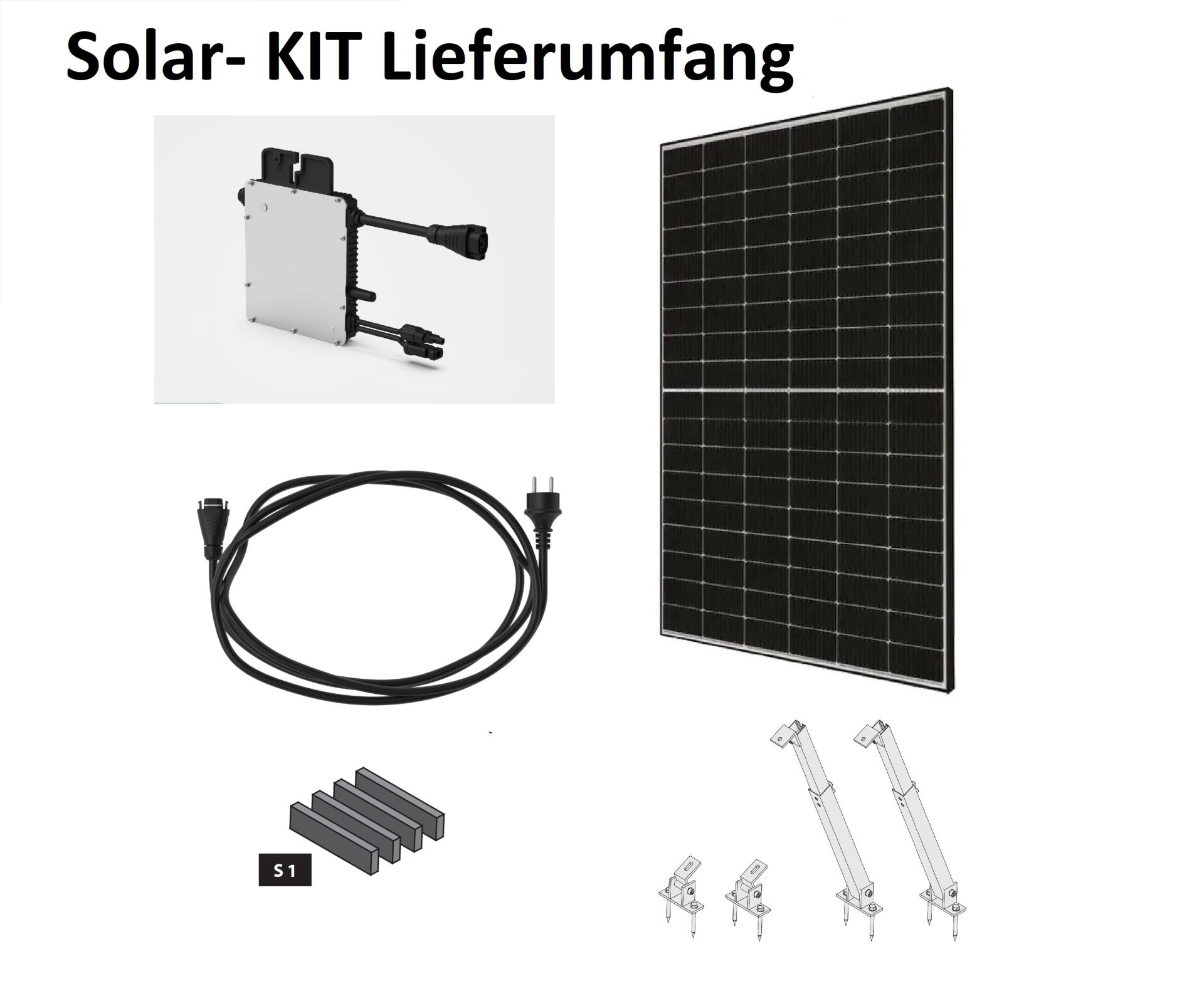 | Lieferumfang Kit | Panel, Wechselrichter, Halterung, 5m Kabel, Konterklötze |