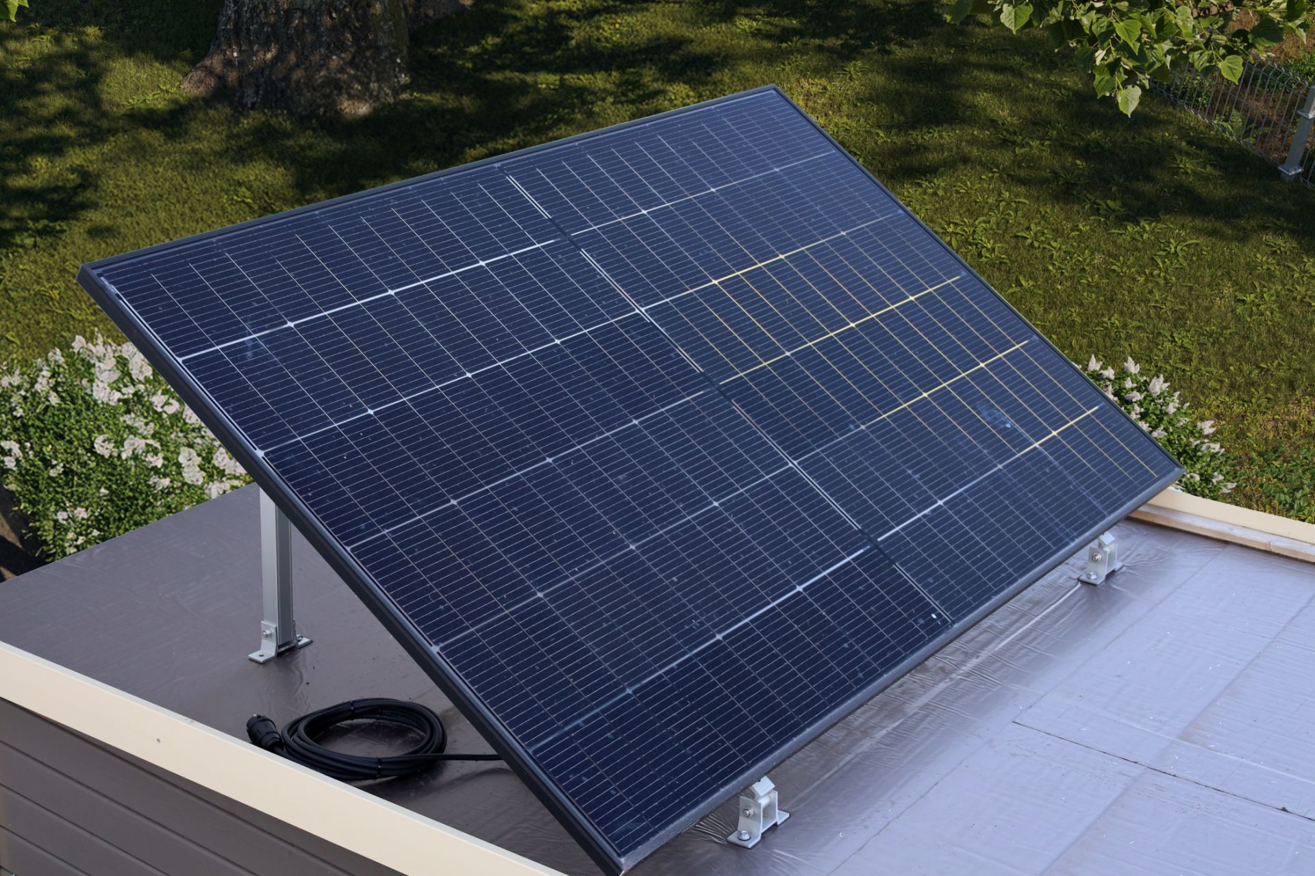 Das Set ist als Plug-and-Play System konzipiert. Die mitgelieferte Metall-Halterung wird mithilfe der Holz-Konterklötze stabil auf dem Pultdach montiert. Das Solarmodul wird per Steckverbindung mit dem Wechselrichter verbunden, welcher dann über das 5 Meter lange Kabel den Strom einspeist.