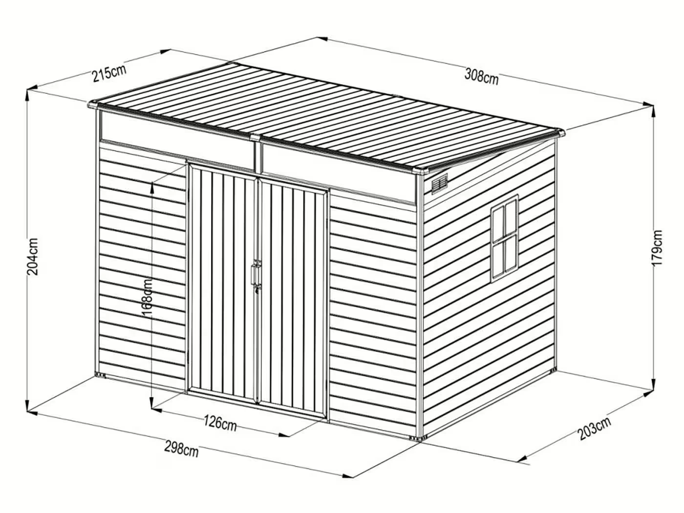 Modernes Gerätehaus aus UV-beständigem Polypropylen und einer stabilen Aluminium-Konstruktion. Das Pultdachhaus „Skye » (298 × 203 cm) überzeugt durch absolute Wartungsfreiheit, ein innovatives Oberlicht für natürliches Tageslicht und ein hervorragendes Preis-Leistungs-Verhältnis.