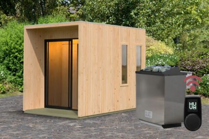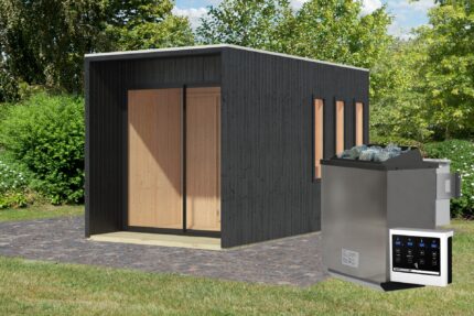 Dacheindeckung optional erhältlich — Ofen, Steuerung und Saunasteine sind im Set enthalten.